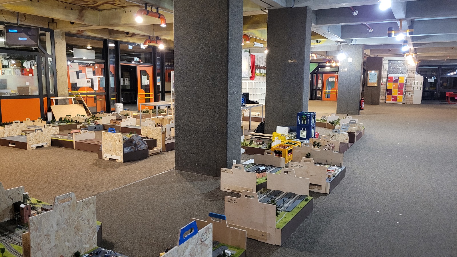 Wir durften mit einer recht großen Modulanlage dabei sein. Der Plan unserer Anlage ist hier im Bild zu sehen. Die beiden blauen Rechtecke sollen die Säulen der Halle darstellen, die wir im Plan berücksichtigen mussten.